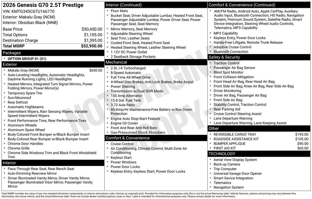 Vatna Gray 2026 Genesis G70 2.5T Prestige AWD 8-Speed Automatic I4 G70 2.5T Prestige, AWD, Android Auto & Apple CarPlay, Auto High-beam Headlights, Auto-dimming door mirrors, Auto-dimming Rear-View mirror, Brake assist, Bumper Applique, Electronic Stability Control, Exterior Parking Camera Rear, First Aid Kit, Fully automatic headlights, Heated front seats, Heated steering wheel, Htd & Ventilated Multi-Adjustable Fr Bucket Seats, Illuminated entry, Leather Seating Surfaces, Memory seat, Navigation System, Panic alarm, Power door mirrors, Power driver seat, Power moonroof, Rain sensing wipers, Remote keyless entry, Reversible Cargo Tray, Roadside Assistance Kit, Steering wheel memory, Steering wheel mounted audio controls, Telescoping steering wheel, Turn signal indicator mirrors, Wheels: 19" x 8.0J Fr & 19" x 8.5J Rr Alloy.