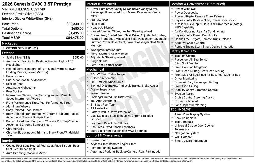 Silver 2026 Genesis GV80 3.5T Prestige AWD 8-Speed Automatic 3.5L DOHC GV80 3.5T Prestige, AWD, 3rd row seats: split-bench, Auto High-beam Headlights, Auto-dimming door mirrors, Brake assist, Electronic Stability Control, Exterior Parking Camera Rear, Fully automatic headlights, Heads-Up Display, Heated and Ventilated Front Bucket Seats, Heated steering wheel, Illuminated entry, Memory seat, Nappa Leather Seating Surfaces, Navigation System, Panic alarm, Power Liftgate, Power moonroof, Rain sensing wipers, Remote keyless entry, Spoiler, Steering wheel memory, Steering wheel mounted audio controls, Tilt steering wheel, Turn signal indicator mirrors, Ventilated rear seats, Wheels: 22" x 9.5J Dark Gray Matte Alloy.