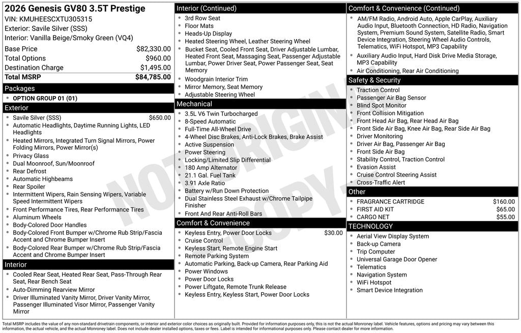Silver 2026 Genesis GV80 3.5T Prestige AWD 8-Speed Automatic 3.5L DOHC GV80 3.5T Prestige, AWD, 3rd row seats: split-bench, Auto High-beam Headlights, Auto tilt-away steering wheel, Auto-dimming door mirrors, Auto-dimming Rear-View mirror, Brake assist, Bumpers: body-color, Cargo Net, Electronic Stability Control, Exterior Parking Camera Rear, First Aid Kit, Fully automatic headlights, Heads-Up Display, Heated & Ventilated Front Bucket Seats, Heated door mirrors, Heated rear seats, Heated steering wheel, Illuminated entry, Leather steering wheel, Memory seat, Nappa Leather Seating Surfaces, Navigation System, NFC Key Card, Power Liftgate, Power moonroof, Rain sensing wipers, Security system, Steering wheel memory, Steering wheel mounted audio controls, Telescoping steering wheel, Turn signal indicator mirrors, Wheels: 22" x 9.5J Dark Gray Matte Alloy.