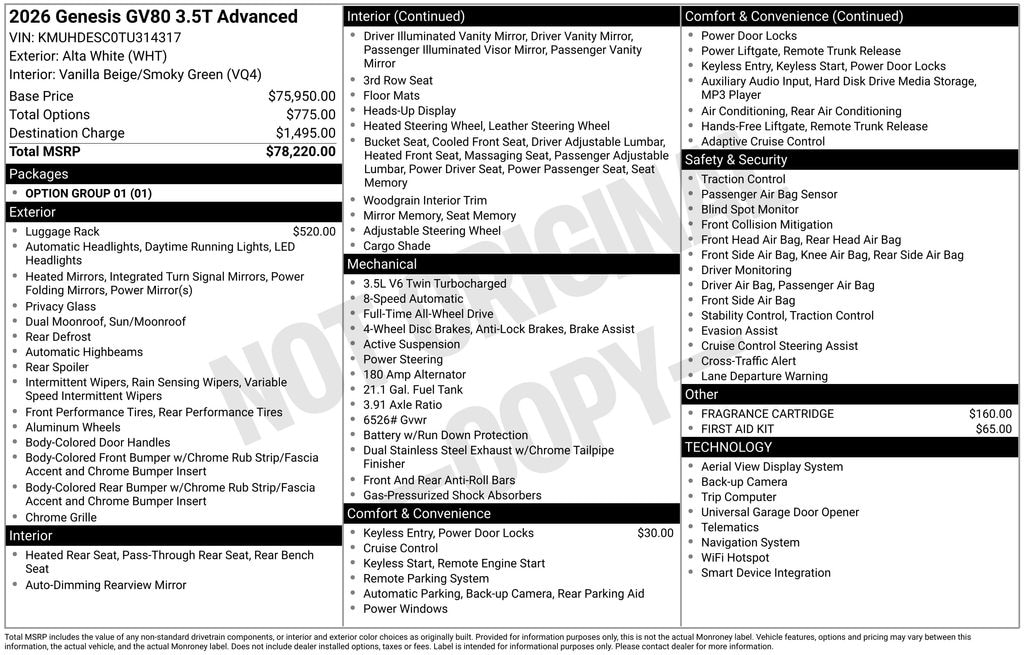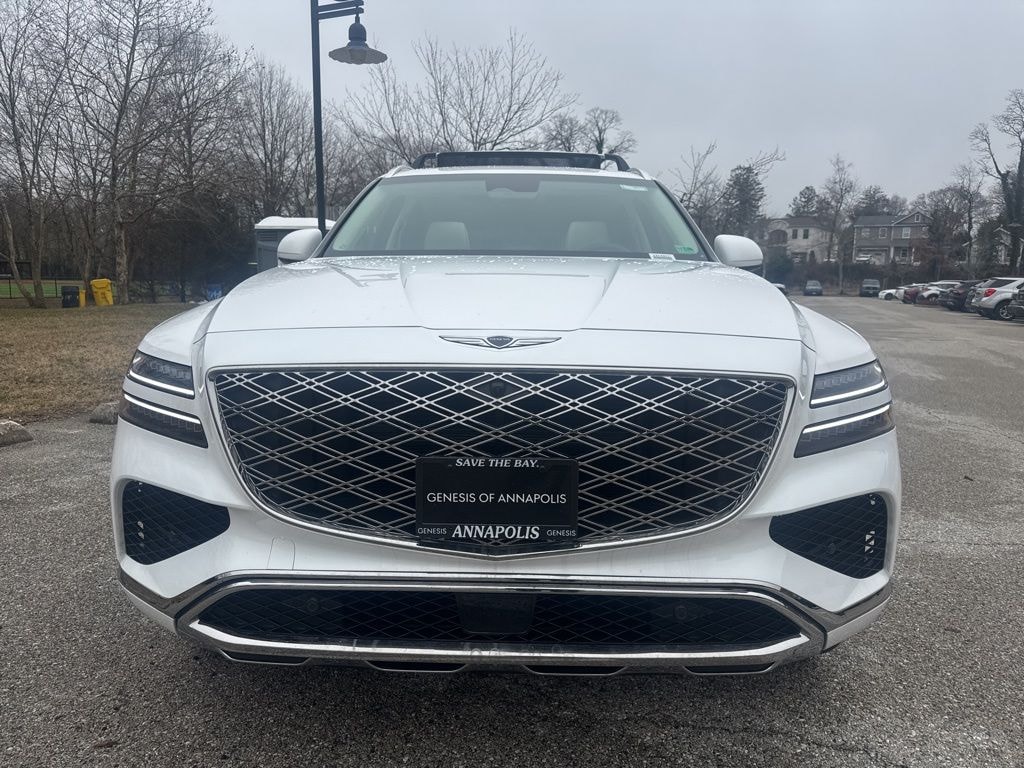 Alta White 2026 Genesis GV80 3.5T Advanced AWD 8-Speed Automatic 3.5L DOHC GV80 3.5T Advanced, AWD, 3rd row seats: split-bench, Auto High-beam Headlights, Auto tilt-away steering wheel, Auto-dimming door mirrors, Auto-dimming Rear-View mirror, Brake assist, Bumpers: body-color, Electronic Stability Control, Exterior Parking Camera Rear, First Aid Kit, Fully automatic headlights, Heads-Up Display, Heated and Ventilated Front Bucket Seats, Heated steering wheel, Illuminated entry, Leather Seating Surfaces, Leather steering wheel, Memory seat, Navigation System, NFC Key Card, Power driver seat, Power Liftgate, Power moonroof, Rain sensing wipers, Remote keyless entry, Security system, Spoiler, Steering wheel memory, Steering wheel mounted audio controls, Telescoping steering wheel, Turn signal indicator mirrors, Wheels: 20" x 8.5J Dark Gray Matte Alloy.