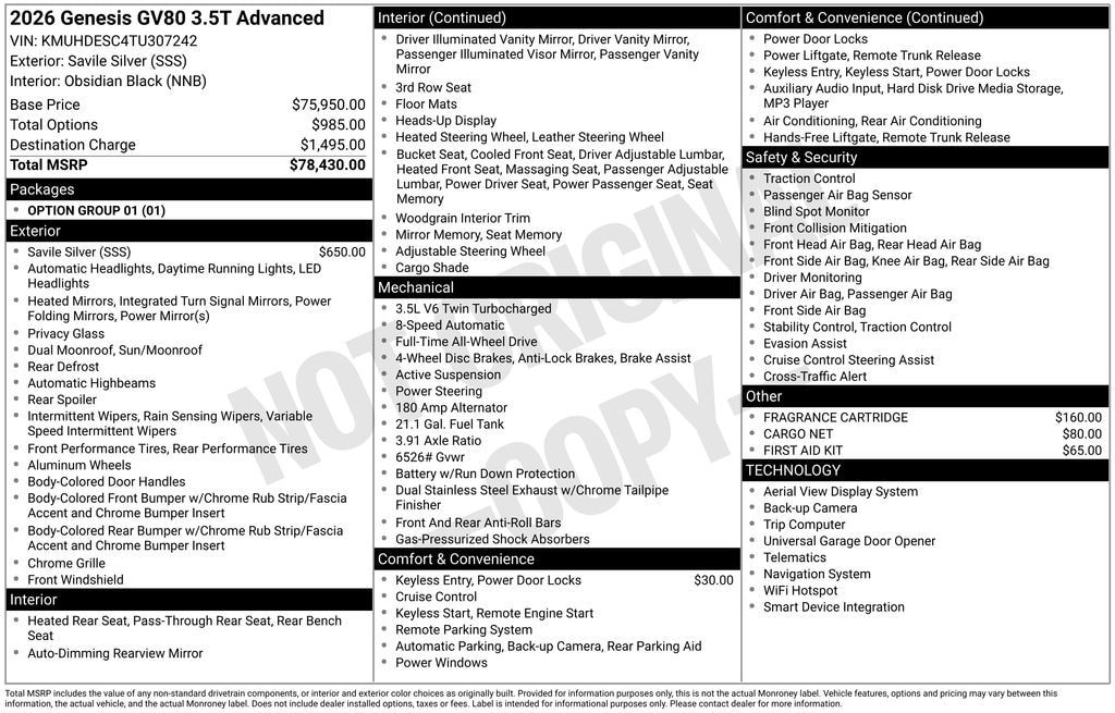 Silver 2026 Genesis GV80 3.5T Advanced AWD 8-Speed Automatic 3.5L DOHC GV80 3.5T Advanced, AWD, 3rd row seats: split-bench, Auto High-beam Headlights, Auto tilt-away steering wheel, Auto-dimming door mirrors, Auto-dimming Rear-View mirror, Brake assist, Bumpers: body-color, Electronic Stability Control, Exterior Parking Camera Rear, First Aid Kit, Fully automatic headlights, Heads-Up Display, Heated and Ventilated Front Bucket Seats, Heated rear seats, Heated steering wheel, Illuminated entry, Leather Seating Surfaces, Leather steering wheel, Memory seat, Navigation System, NFC Key Card, Power Liftgate, Power moonroof, Rain sensing wipers, Remote keyless entry, Security system, Speed control, Spoiler, Steering wheel memory, Steering wheel mounted audio controls, Telescoping steering wheel, Turn signal indicator mirrors, Ventilated front seats, Wheels: 20" x 8.5J Dark Gray Matte Alloy.