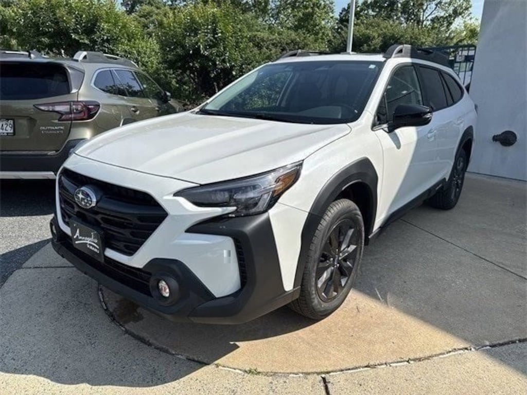 Here at Annapolis Subaru we have a brand new Crystal White Pearl on Gray 2025 Subaru Outback Onyx Edition for sale (see dealer for pricing). This Subaru has the 2.5L H-4 CVT automatic AWD REGULAR unleaded powertrain that returns 26 mpg city/28 mpg combined/32 mpg highway. The convenience features are 1-touch down, 1-touch up, Adaptive Cruise Control, air conditioning, auto-dimming rearview mirror, automatic temperature control, driver door bin, driver vanity mirror, emergency communication system with Star-Link Safety Plus (3-year free trial), front beverage holders, front dual zone A/C, garage door transmitter (Home-Link), heated steering wheel, illuminated entry, moonroof sunshade (manual), overhead console, passenger door bin, passenger vanity mirror, power moonroof, power windows, rear beverage holders, rear door bins, remote keyless entry, telescoping steering wheel, tilt steering wheel and a trunk/hatch with auto latching feature. The suspension and handling features are alloy wheels, four wheel independent suspension, front and rear anti-roll bars, 225/60HR18.0 front and rear tires, power steering, speed-sensing steering and 18 inch wheels. The entertainment features are 1st row LCD monitors (2), AM/FM radio (Sirius XM), 11.6 inch primary LCD size screen, satellite radio trial duration with new vehicle purchase of 4 months, smart device integration (Star-Link/Apple CarPlay/Android Auto), Harman/Kardon speakers (12), steering wheel mounted audio controls and wireless phone connectivity (Bluetooth). The warranties are 36 months/36,000miles for the basic warranty, 60 months/ unlimited mile distance for the corrosion perforation warranty, 60 months/60,000miles for the powertrain warranty and 36 months/36,000miles for the roadside assistance coverage. The seats and trim features are front bucket seats with a center armrest and storage, heated front seats, leather shift knob, leather steering wheel, max seating capacity (5), power 2-way driver lumbar support, power driver seat, rear seat center armrest, rear split foldable bench seat and a leatherette StarTex seat upholstery. The off road capabilities are 18 degrees for the approach angle, 22 degrees for the departure angle, 8.7 inches for the ground clearance and 19 degrees ramp breakover angle. The body exterior features are auto dimming door mirrors, body colored bumpers, heat/power/turn signal integrated door mirrors, roof rack and a spoiler. This Outback has a towing capacity of 2,700lbs. The lighting, visibility and instrumentation features are analog gauges, auto high-beam headlights, Blind Spot Detection (BSD) warning, compass, rear exterior parking camera, front fog lights, front reading lights, fully automatic headlights, lane departure (active EyeSight integrated Lane Keep Assist active), low tire pressure warning, outside temperature display, rear window defroster, rear window wiper, tachometer, trip computer and variably intermittent wipers. The safety and security features are 4 wheel disc brakes, ABS brakes, adjustable head restraints (driver and passenger w/tilt), brake assist, dual front and side impact airbags, electronic stability, Eye-Sight integrated front Pre-Collision Braking mitigation, front pedestrian detection (prevention), ignition disable, knee airbag, occupant sensing airbag, overhead airbag, panic alarm, perimeter/approach lights, Rear Cross Traffic Alert (RCTA)/Reverse Automatic Braking (RAB) mitigation, security system, tracker system with integrated Star-Link Security Plus (6-months free trial) and traction control.